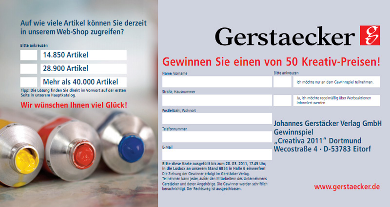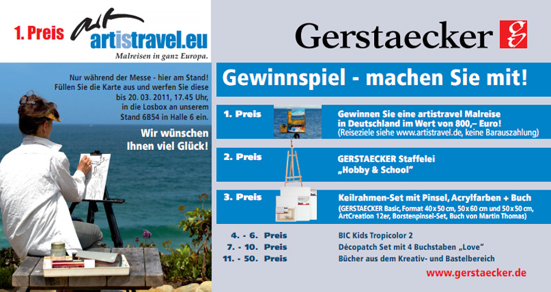 Neu in diesem Jahr: Zum ersten Mal können Messebesucher artistravel auch GEWINNEN! Wer die Karte unten ausdruckt, ausfüllt und am GERSTAECKER Stand (Halle 6, Stand B54) in die Losttrommel wirft, hat die Chance eine Malreise in Deutschland im Wert von 800,- Euro zu gewinnen. Ein Besuch kann sich also lohnen. Das artistravel Team freut sich schon auf Sie.