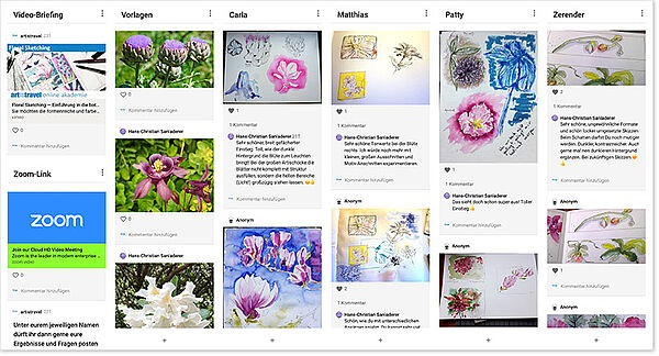 Wir haben dabei nicht einfach vorhandene Kursformate kopiert sondern ein ganz eigenes Konzept entwickelt. Wichtig für uns: Das Konzept sollte weitgehend barrierefrei sein – für Dozenten und Gäste, und es sollte Spaß machen, wie ein ‚richtiger‘ artistravel-Kurs. Keine endlosen, wackeligen ZOOM oder (noch schlimmer) Skype Sessions, sondern eine Mischung, die unserem Qualitätsanspruch gerecht wird und positive Gruppendynamik entstehen lässt.
