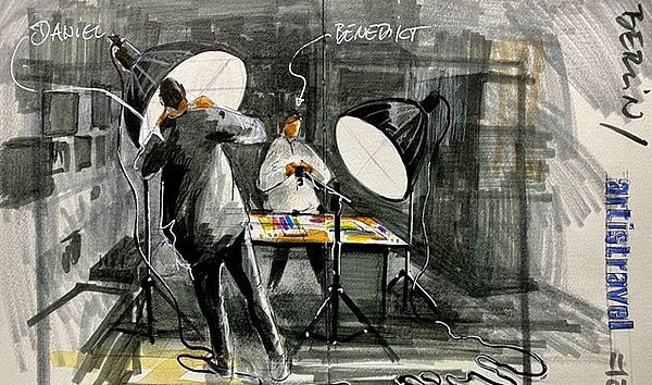 Bild: Zwei Mann und jede Menge Technik: artistravel Dozent Jens Hübner hält den Aufbau des Studios in seinem Atelier in einer Skizze fest.