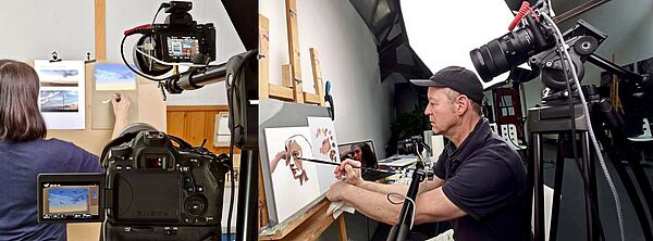 Für den Dreh laden wir die Dozenten in unsere Studios ein, oder besuchen sie in ihren Ateliers. Am Drehtag stehen sie dann im Mittelpunkt. Die Kamera muss jedes Detail des Arbeitsprozesses zeigen, damit die Kursteilnehmer ihn später Schritt für Schritt nachvollziehen können. Gleichzeitig muss die Regie darauf achten, dass der Künstler in seinem Sprechtext alle notwendigen Informationen zum Kursinhalt gibt, während er arbeitet. Das Licht muss sitzen, alle Anschlüsse stimmen. Also ordentlich was zu tun. Am Ende eines Drehtages sind alle Beteiligten meist rechtschaffen müde. Filmen ist anstrengender als der Laie glauben würde!