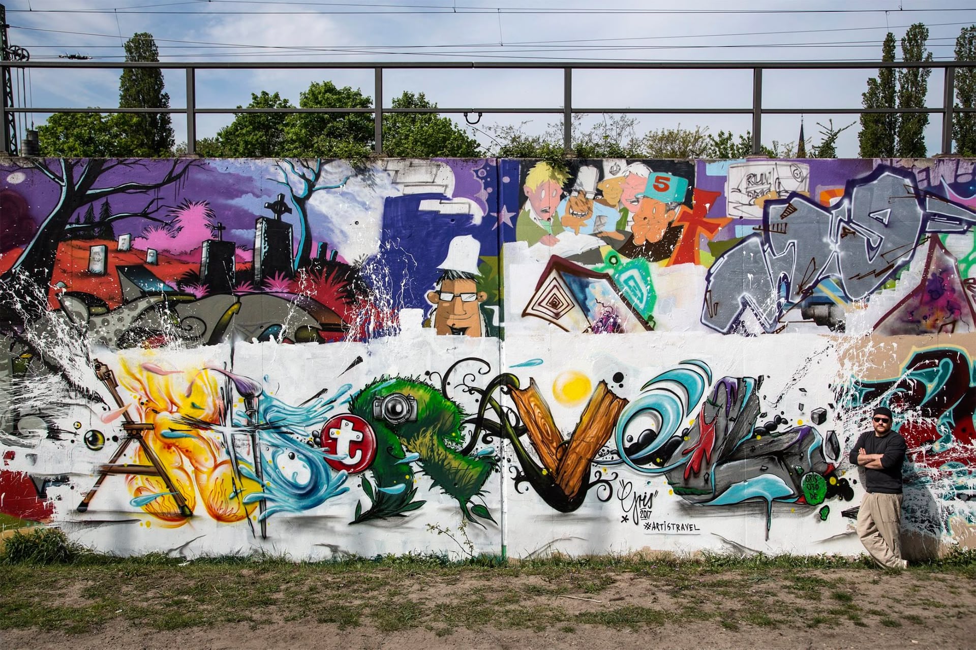Wir fühlen uns geehrt. Unser Dozent GRIS hat es nicht nehmen lassen, in Berlin eine Wand mit artistravel-Graffiti zu versehen. Fast 10m breit, fast 3m hoch. Das muss uns jetzt erst mal einer nachmachen! Da wundert es nicht, dass unsere Kurse in Berlin laufen wie geschmiert!Im Bild sieht man den Künstler aus Berlin mit seinem großartigen Werk: