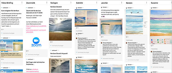 Die Mischung macht's: Es gibt Live Konferenzen und Bildbesprechungen mit einer kleinen, netten Gruppe, vorab erhalten alle Teilnehmer ausführliche Lernvideos mit klaren Aufgaben. Eine zentrale, übersichtliche Kurs-Pinnwand sorgt dafür, dass niemand den Überblick verliert. Hier können Sie sich austauschen und Bilder hochladen. Hier betreut der Dozent seine Gruppe außerhalb der Videokonferenz, gibt Tipps und reagiert auf Ihre Arbeitsproben.